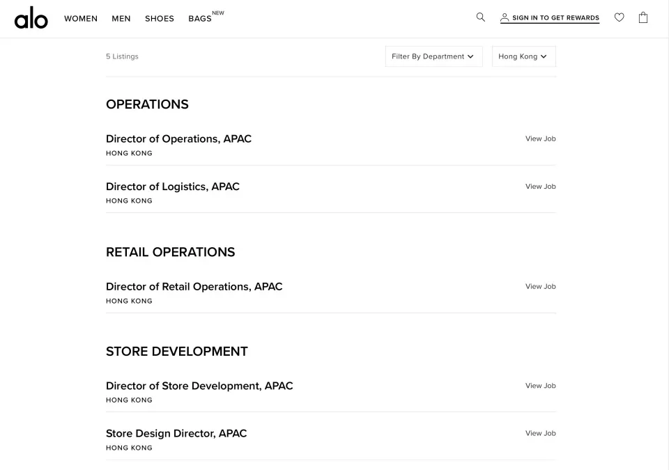 几乎同一时间,alo官网更新了数个亚太区职位,办公地点均设于香港,涵盖零售管理、电商运营、门店开发等岗位。