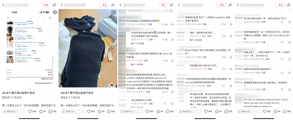 一位一直在观望alo,住在深圳的消费者王玉玟坦言,自己对这个品牌的态度颇为矛盾。“我大概在2024年底就刷到alo的种草帖子了,当时确实很火,很多明星上身,但我一直没见过实物,也不敢盲目找海淘下单。”