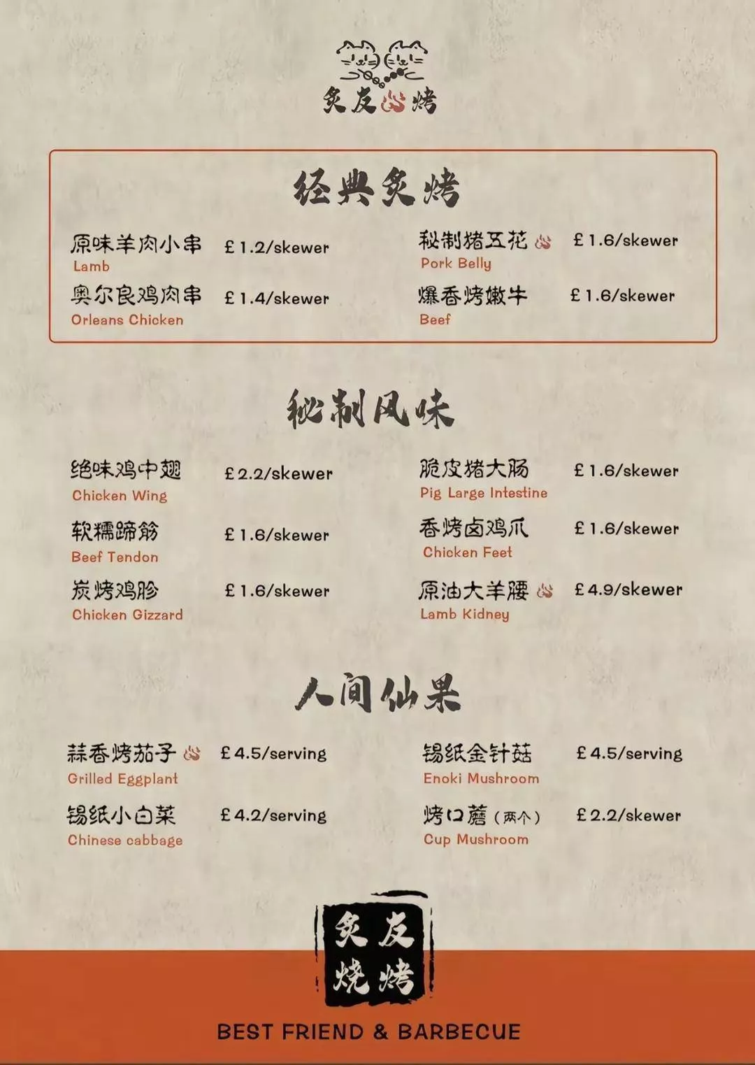 2025年的一张菜单显示,烧烤摊有羊肉小串、猪五花、鸡肉串、翅中、茄子、小白菜等菜品,价格分别为1.2英镑(约合人民币11元)、1.6英镑(约合人民币14.6元)、1.4英镑(约合人民币12.8元)、2.2英镑(约合人民币20元)、4.5英镑(约合人民币41元)、4.2英镑(约合人民币38.4元)。