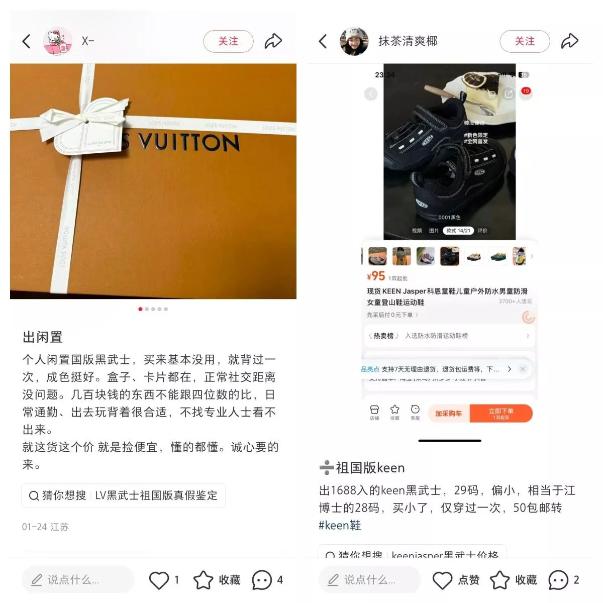 “出1688入的KENN黑武士,50包邮转”“出‘祖国版’香奈儿包”“出‘祖国版’LV,几百块肯定没法跟原版比,但不凑近看根本看不出来,这个价格就是捡漏,懂的都懂。”