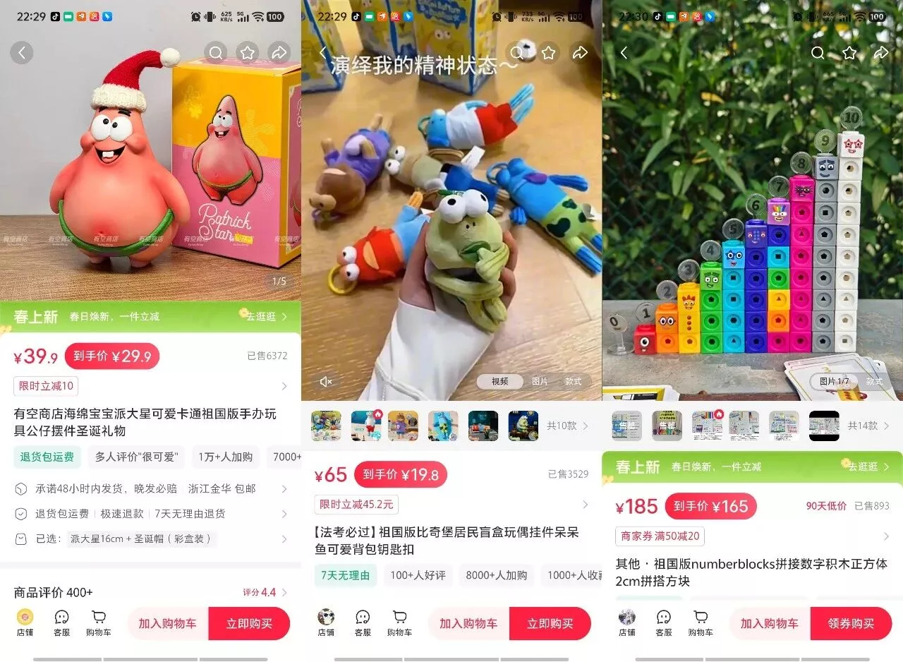 从销量来看,这类商品的市场需求不容小觑。截至3月14日,某商家所售“派大星手办”,售价39.9元,已售6372件;另一商家所售“祖国版比奇堡居民呆呆鱼”,到手价19.8元,已售3529件;还有商家所售“祖国版numberblocks积木”,售价66.4元,已售893件。