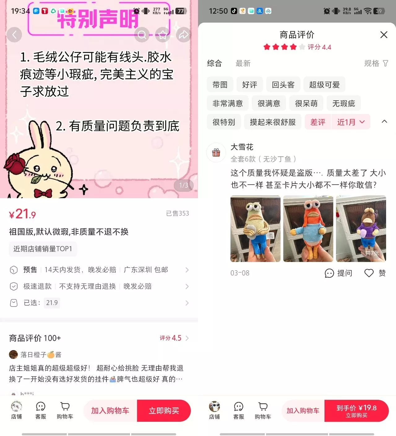 在小红书平台,有用户就在销售超过3527件的“祖国版比奇堡居民呆呆鱼”商铺,给出售后评价:“这个质量怀疑是盗版,甚至卡片大小都不一样。这你敢信?”或许他不明白的是,所谓“祖国版”,其实本就是盗版。