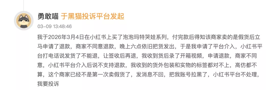 另一位消费者的经历则更扎心。3月4日,他在小红书买了泡泡玛特哭娃系列,付完款后得知该商家卖的是假货,立马申请退款,商家不同意退款,晚上六点依旧把货发出。于是申请平台介入,小红书平台打电话说发货了不能退,让签收后再退——结果是,消费者收到货后录了开箱视频,申请退款,商家不同意,小红书平台介入后说不支持退款,偏袒商家。“收到货外包装和实物标签都对不上,高仿都不算。”
