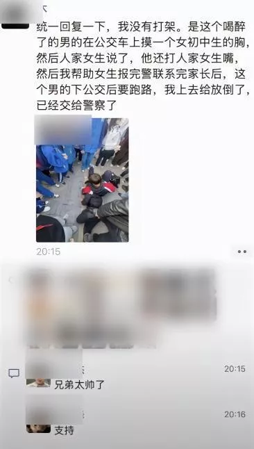 记者注意到,疑似当事人在社交平台贴出图片中,一名男子被学生包围,一名黄头发的学生压住男子的上半身,将其摁在地上不能动弹。在评论区,还有网友贴出当事人的朋友圈截图。截图中写道:“我没有打架,是这个喝醉了的男子在公交车上摸一个初中女生的胸,然后人家女生说了,他还打女生的嘴,然后我帮女生报完警联系完家长后,这个男的下公交车要跑路,我上去给放倒了,已经交给警察了。”