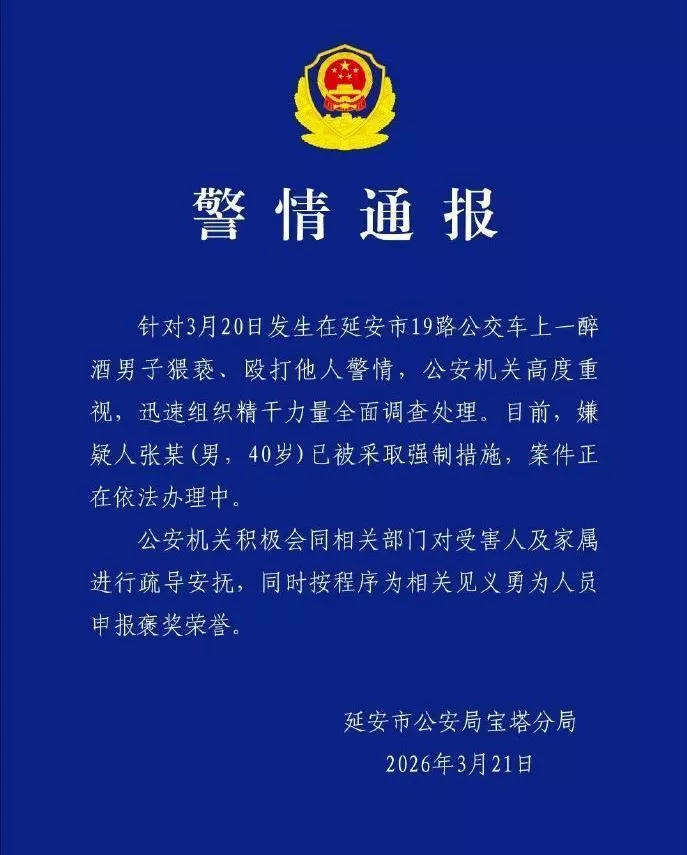 极目新闻记者注意到,21日晚,延安市公安局宝塔分局发布警情通报:针对3月20日发生在延安市19路公交车上一醉酒男子猥亵、殴打他人警情,公安机关高度重视,迅速组织精干力量全面调查处理。目前,嫌疑人张某(男,40岁)已被采取强制措施,案件正在依法办理中。公安机关积极会同相关部门对受害人及家属进行疏导安抚,同时按程序为相关见义勇为人员申报褒奖荣誉。