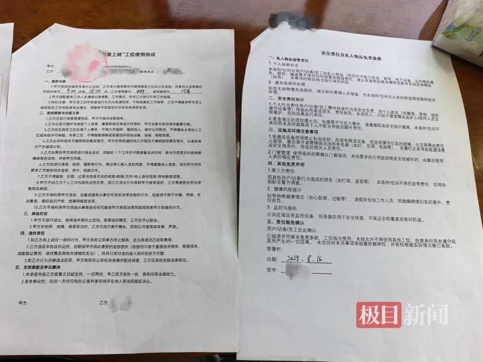 “我们签协议的。”陈英健向记者展示了一沓文件,包括《工位使用协议》和《安全责任及私人物品免责条款》。《工位使用协议》的“服务内容”中提到,公司可能配有员工对乙方(使用者)演绎记录考勤、工作情况,并进行日常工作监督。协议特别注明:所有督促行为均为表演性质,不构成真实工作指导,使用者不得要求公司员工提供实际工作协助或专业建议,该服务不改变双方非劳动关系的本质。“使用限制与合规义务”条款则明确了多项要求:使用者需自行维护与保管个人信息,必须向其相关方阐明现场真实情况,避免各方产生错误认知,不得利用公司场地、设备或服务从事任何违反法律法规的行为等。