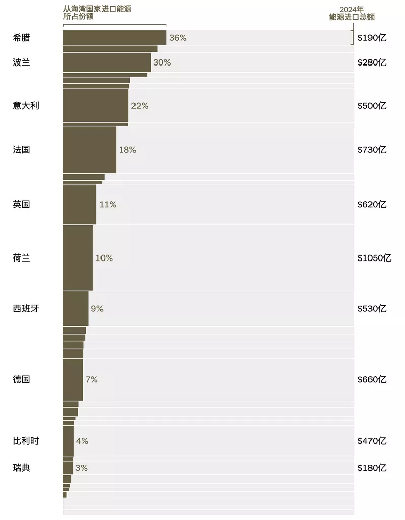 与亚洲相比,欧洲传统上对海湾能源的依赖度更低。该地区曾主要从俄罗斯进口天然气,但近年来更多依赖美国和挪威。不过近几年,欧洲不得不接连应对能源危机,包括俄乌战争及随后的西方对俄制裁。