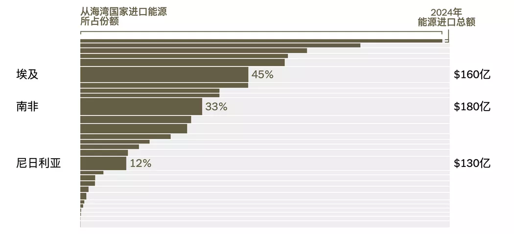 与众多全球南方国家一样,非洲各国受到程度不一的供应冲击。非洲东海岸的岛国塞舌尔2024年几乎全部能源都从海湾国家进口;毛里求斯对海湾能源的依赖度与之相近。石油资源丰富的欧佩克+成员国尼日利亚则传统上从中东进口的化石燃料相对较少。