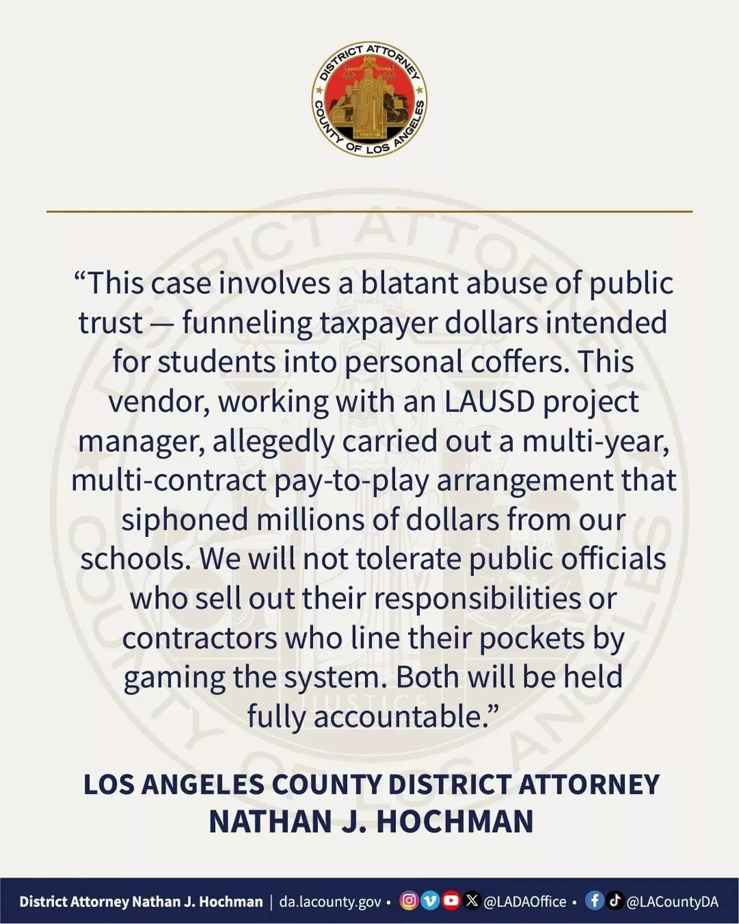 霍克曼在宣布诉讼时表示:“这起案件涉及公然滥用公众信任——将原本用于学生的纳税人资金挪入个人腰包。这种长达数年、签订多份合同的权钱交易安排,从我们的学校吸走了数百万美元。我们不会容忍出卖职责的公职人员,或通过操纵系统中饱私囊的承包商。双方都将受到全面追究。”