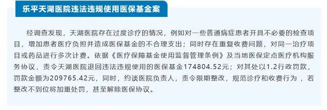 2025年10月,景德镇市曾公布一批违规使用医保基金典型案例,其中提到,天湖医院存在过度诊疗情况,对一些普通病症患者开具不必要的检查项目,增加患者医疗负担并造成医保基金的不合理支出;同时存在重复收费问题,对同一治疗项目或药品进行多次计费。依据《医疗保障基金使用监督管理条例》,医保部门责令天湖医院退回违法违规使用的医保基金174804.52元,并处以行政罚款209765.42元。同时,约谈医院负责人,责令限期整改,并明确告知若整改不到位将加重处罚,甚至解除医保协议。