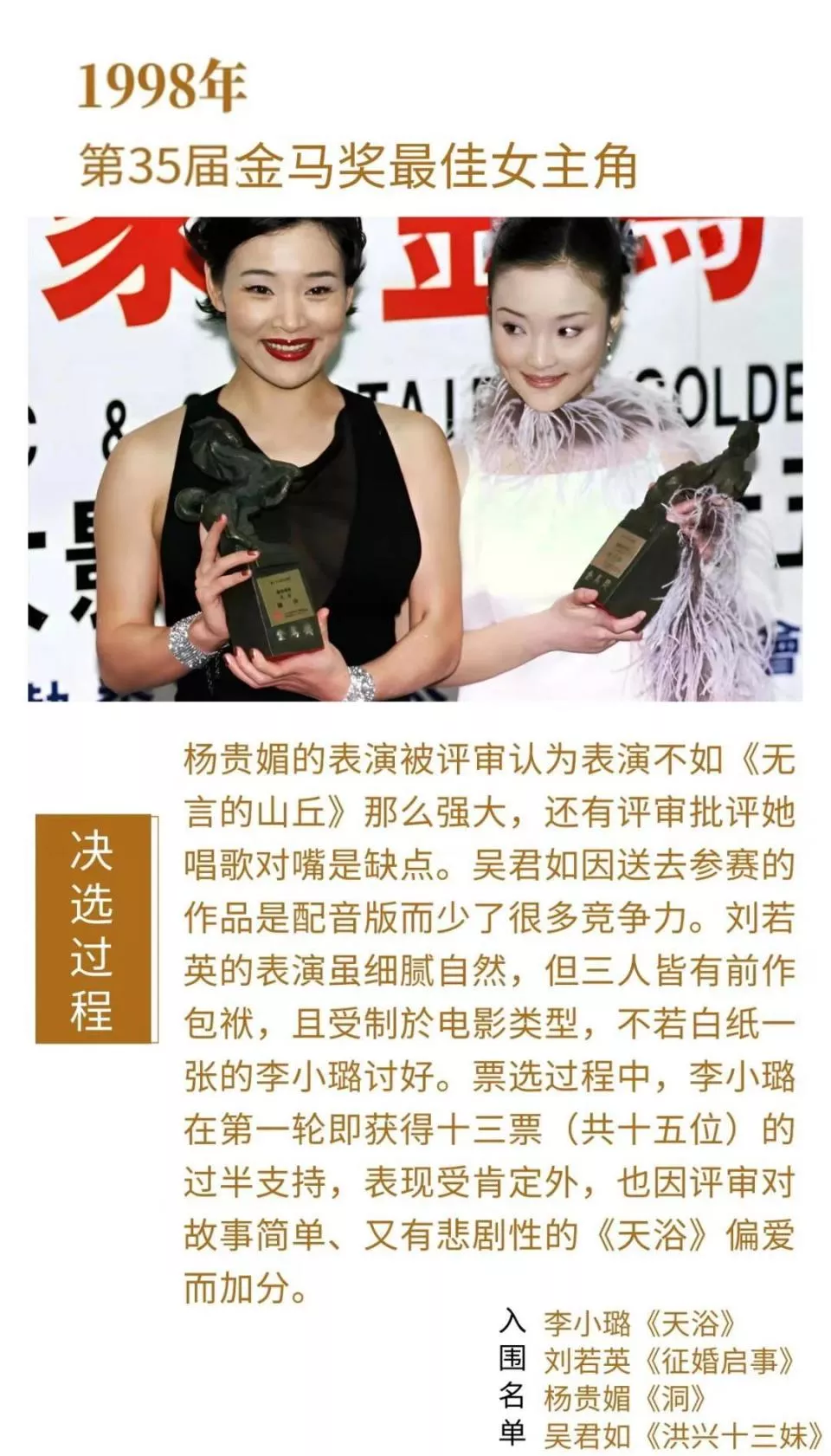 直至16岁这年,她因在陈冲执导的电影《天浴》中出演了女主角文秀,打败刘若英、杨贵媚和吴君如,摘得金马奖影后桂冠,一炮而红。