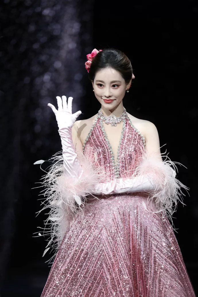 不得不说,祝绪丹和粉色的适配度非常高,粉色挂脖礼服像极了“粉钻人鱼姬”,蓬松微卷长发更显清秀气质,粉色亮片加上轻轻下垂的羽毛袖套,让整个人在镜头下都闪闪发光。