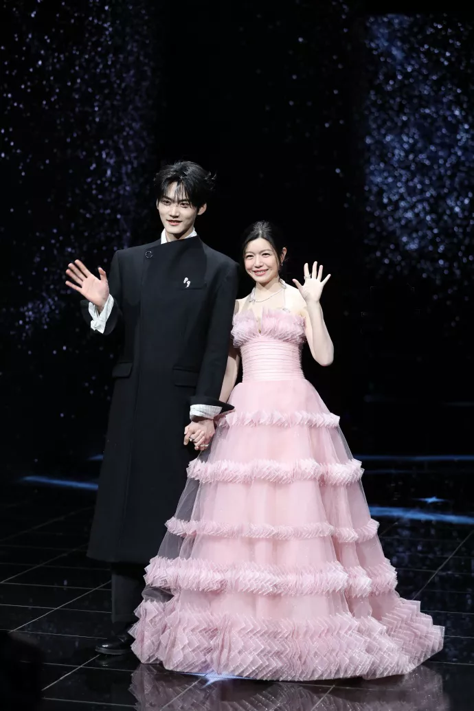 陈妍希、周柯宇牵手走红毯,一个是粉色公主裙,一个是黑色骑士风西装,三连拍、同步比心等互动环节太高能,让人梦回《狙击蝴蝶》里的名场面。