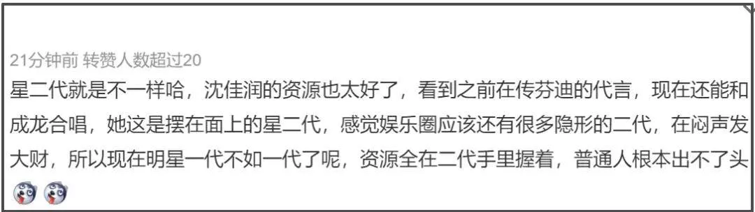 比起沈佳润在歌曲中的演唱水平,大家明显更在意她能和成龙合唱这件事。毕竟,推广曲不是现场LIVE,既代表不了沈佳润的演唱实力,也体现不出沈佳润演唱水平是否进步。但是,和成龙合唱春节档影片推广曲这件事却直接展现了沈佳润作为星二代拥有的顶级资源。
