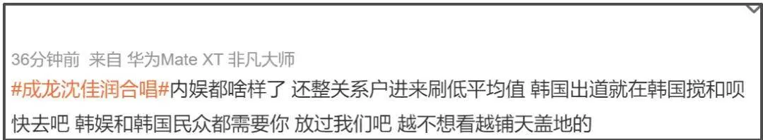 意料之外,情理之中地,沈佳润这一次口碑大翻车。在“成龙沈佳润合唱”的话题广场中,大批网友吐槽沈佳润是资源咖、关系户。有人提起沈佳润之前在跨年晚会上和毛不易合唱《不染》跑调、实力被吊打,指责她短暂消停一个月之后又开始出来蹦跶。