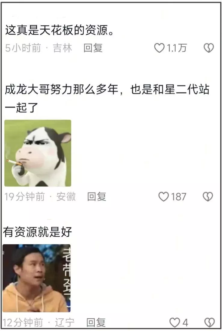 德不配位,却依旧受到力捧的结果就是路人缘崩塌,全网口碑翻车。沈佳润在某短视频平台发布了和成龙合作的推广曲片段,该视频评论区前排沦陷。大家一边感叹着沈佳润这“天花板的资源”,一边阴阳怪气地留言“成龙大哥努力那么多年,也是和星二代站一起了”。