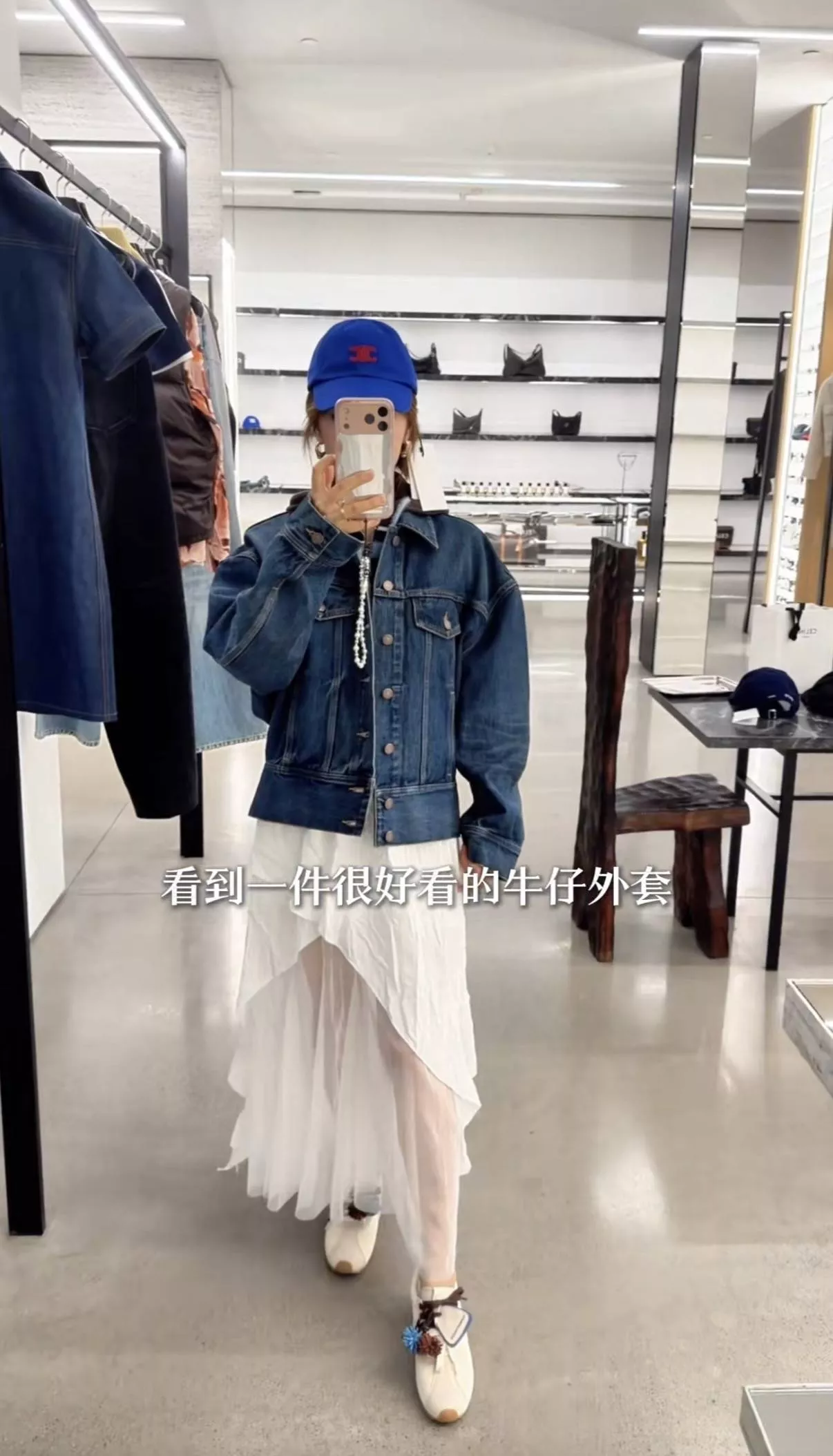 她还试了一件很好看的牛仔外套,牛仔外套的款式有点中规中矩的,经典深蓝色、说不出好看不好看,感觉挺一般的。
