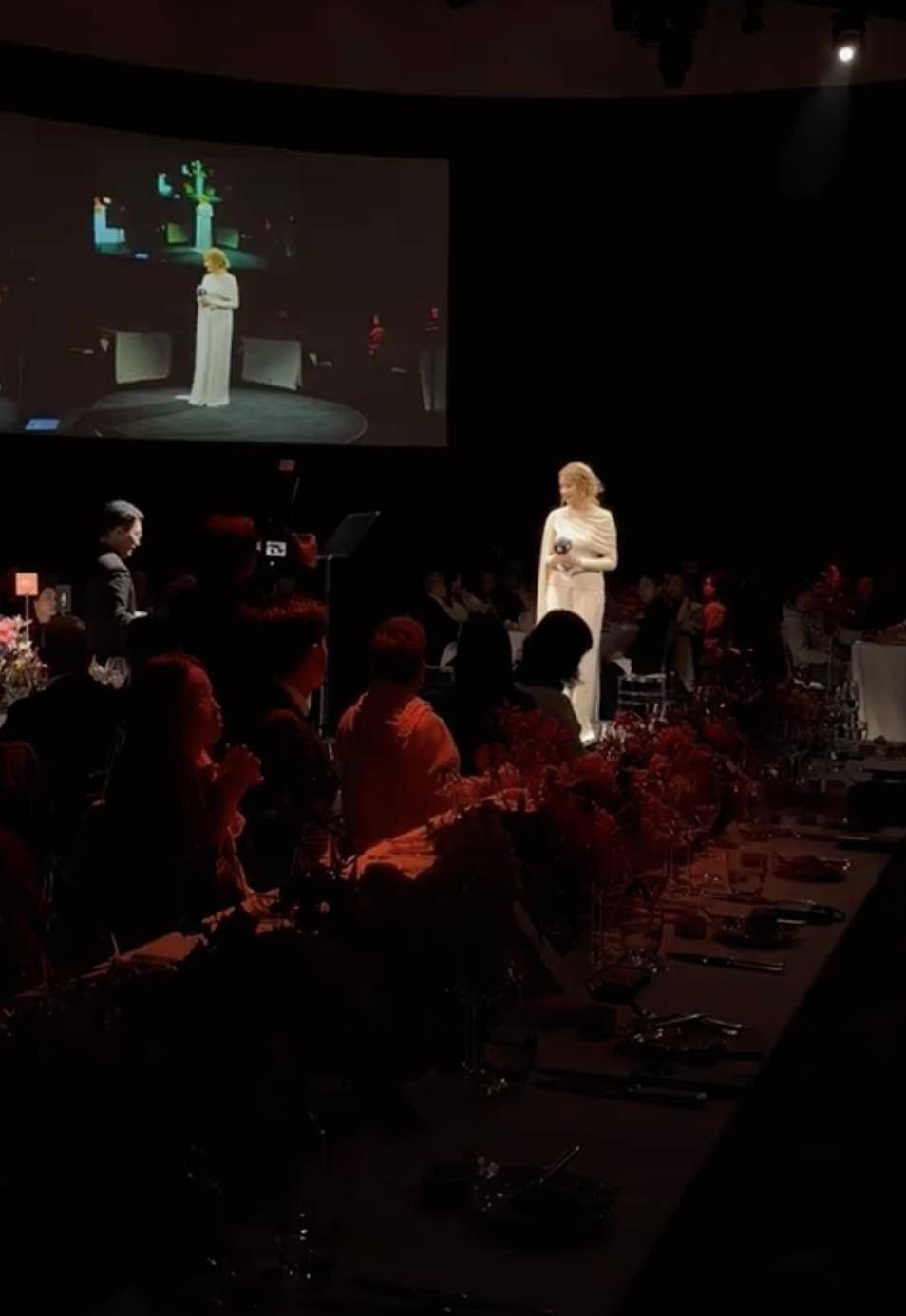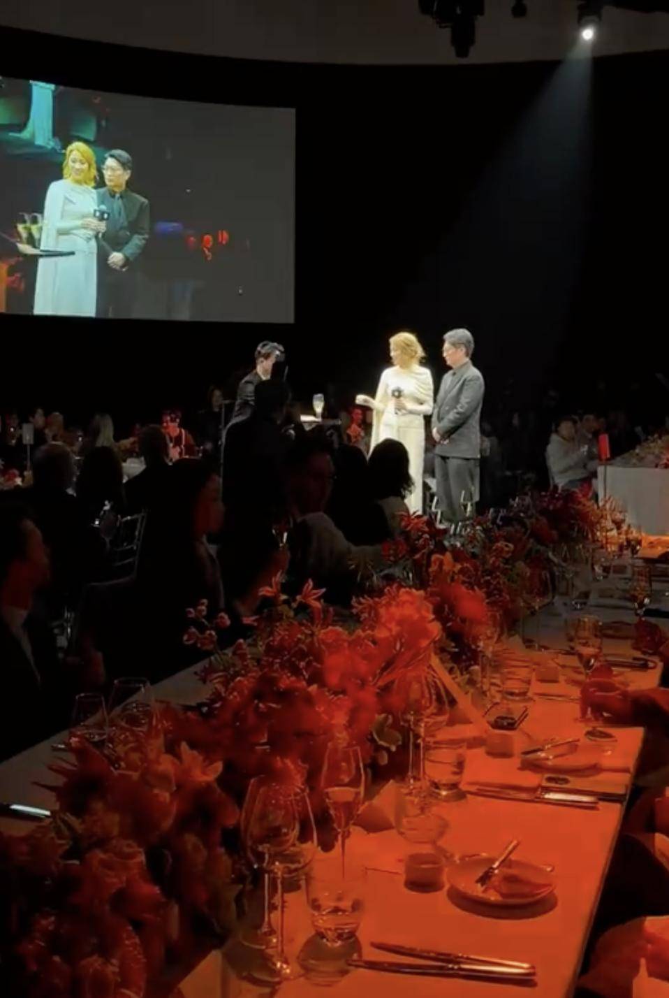 而此时,43岁的徐子淇久未现身,和以往相比,她显得更加圆润了些,但她那一头金色的秀发依然如故。她的着装非常得体,选了一套米黄色的优雅套装,阔腿裤配上修身长袖,披上一条拖地的披肩,整体看上去既高贵又柔美。站在舞台上,她始终与李家诚配合默契,照顾到各个方位的嘉宾,不时微笑着与大家互动。之后,夫妻俩举杯敬酒,笑容满面,展现了他们和谐的夫妻关系。客观来看,徐子淇的举止优雅、从容大方,完全符合一个主席夫人应有的气质。