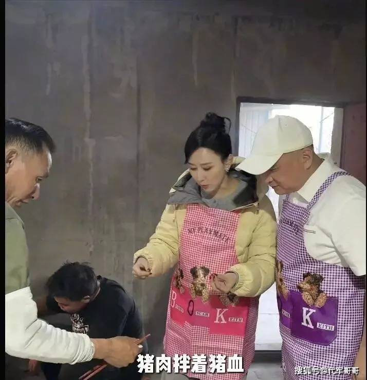 这场全猪宴堪称“烟火气天花板”,现烤五花、油炸坨坨肉、现炸酥肉搭配八大碗热菜,每一道都藏着乡村美食的质朴风味。胡静和朱兆祥丝毫没有豪门架子,随便找个位置坐下,与乡亲们挤在同一张小方桌上大口吃肉、开怀畅谈,吃到额头冒汗,彻底被家乡风味“香迷糊”。更接地气的是,两人还特意换上了围裙——胡静的粉色小围裙搭配俏皮丸子头,朱兆祥的紫色围裙则尽显反差萌,堂堂豪门总裁乖乖化身“打下手”,跟着胡静在厨房忙活,即便动作生疏,却格外默契。