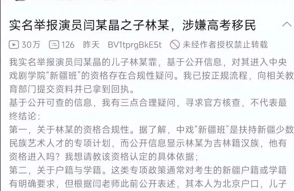 中戏的“新疆班”本是为培养少数民族艺术人才设立的政策性班级,对考生的民族身份有明确要求。 而她的儿子林傲霏是汉族,且户籍在北京。