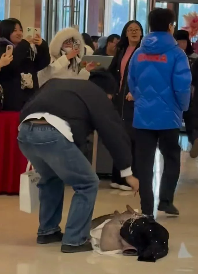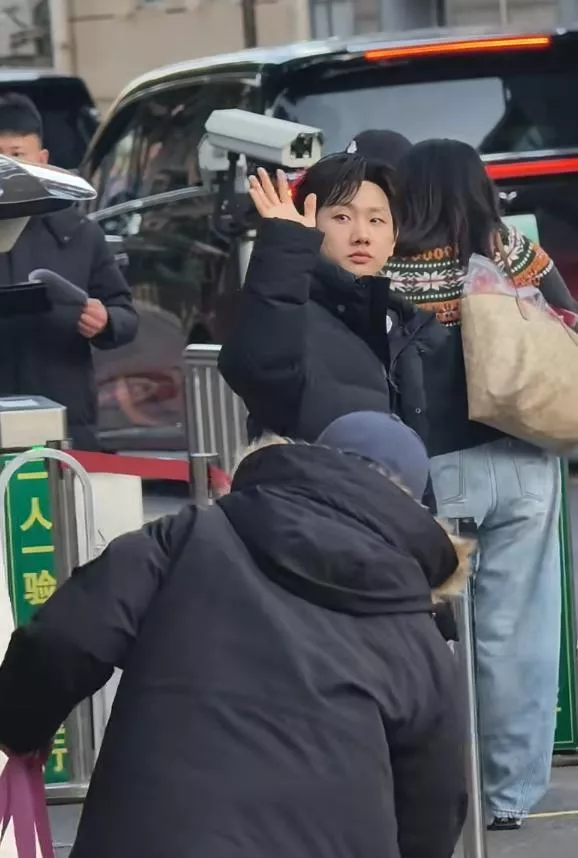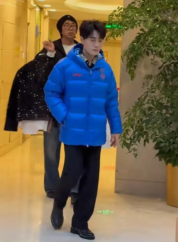 王铮亮的宝蓝色羽绒服好扎眼,后面助理拿着的黑色表演服闪闪亮亮的,走到半道手一滑全掉地上,简直笑不活了。