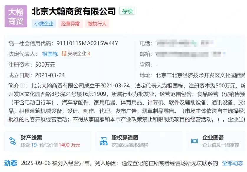嘎子哥又被处罚,新增执行1400万,这辈子都不可能翻身了,近日,北京大翰商贸有限公司新增被执行人信息,执行标的约1400万元,引发舆论关注,该公司由“嘎子哥”谢孟伟妻子郭珊珊持股30%,此前还曾因“通过登记住所无法联系”被列入经营异常名录,种种信息叠加,使外界再次把目光聚焦到谢孟伟及其家庭的商业布局上。