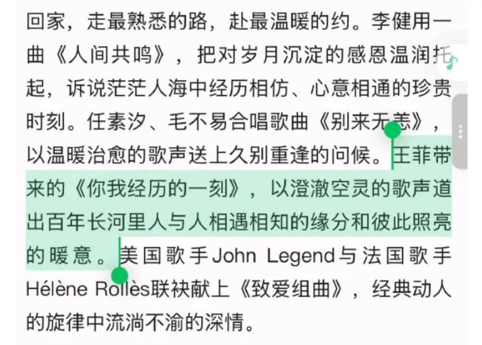 与此同时,春晚彩排的官宣内容里,正式公布了王菲即将演绎独立乐队ZaZaZsu(砸砸苏)的作品《你我经历的那一刻》,一贯温情的风格,和王菲空灵的声线相得益彰。