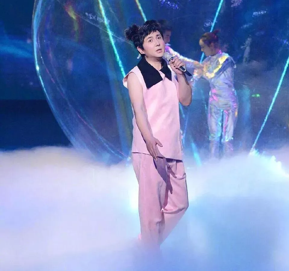 那年的王菲穿着粉色长旗袍,搭配俏皮的双丸子哪吒头,搭配夸张腮红开嗓。