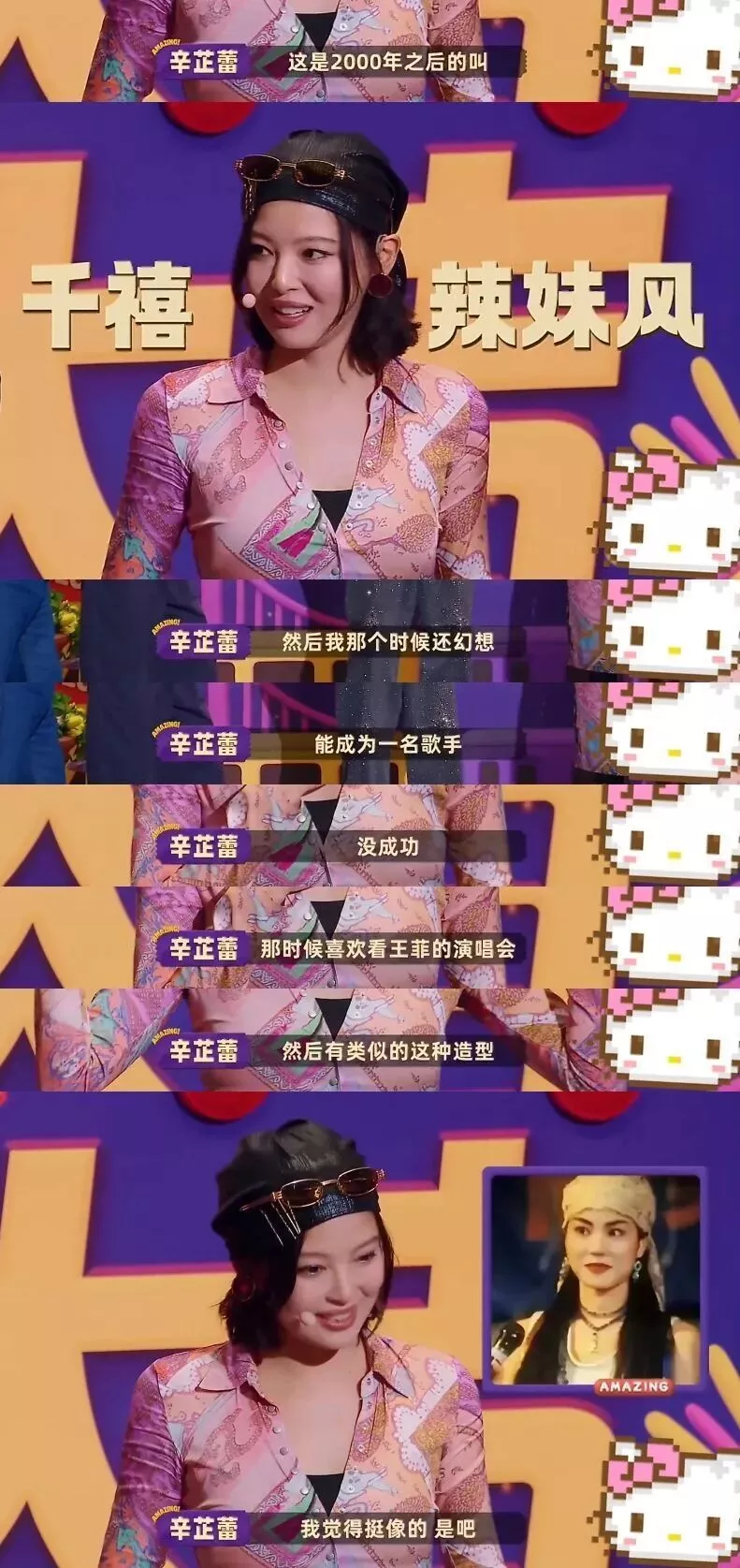 2025年9月,辛芷蕾一身辣妹穿搭录制节目,直言这就是自己幻想中20岁的样子,坦言是因为喜欢王菲,才选择了这套造型。