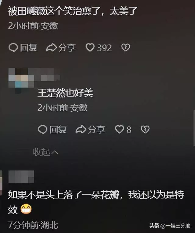 旁边人拿下花瓣,田曦薇笑得很甜美。