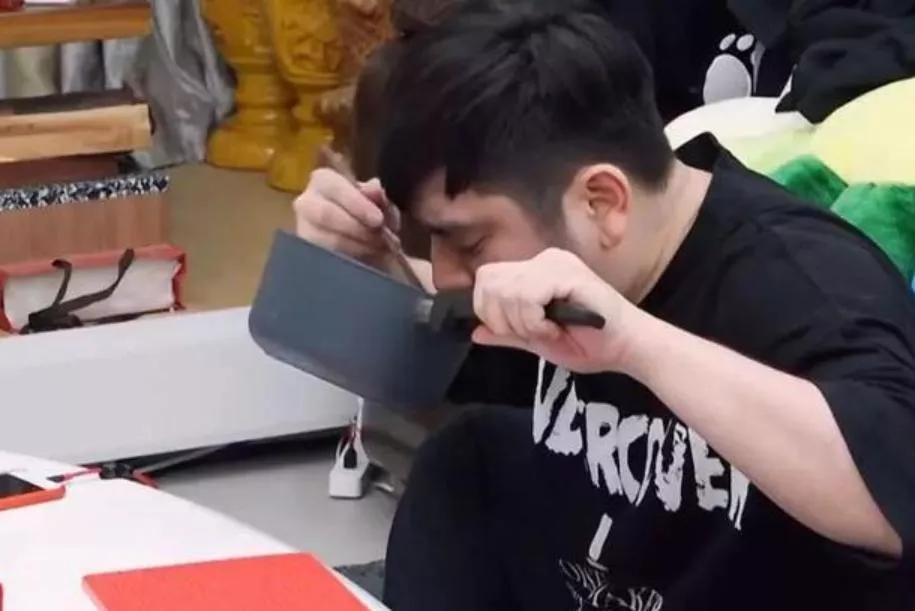 在家看电视的他即便已经到了深夜,仍然会煮一大碗泡面,最后连汤都要喝干净。
