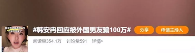 韩安冉刚结束第四段婚姻,马上交到国外男友,不料被他骗走百万,2026年2月25日,韩安冉再次占据微博热搜,原本以为只是一次高调恋爱的日常更新,没想到剧情急转直下,前几天还在夸赞外籍男友颜值与性格,转眼就自曝被骗近百万元。