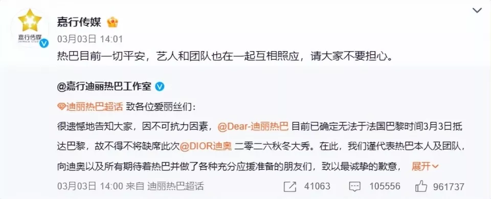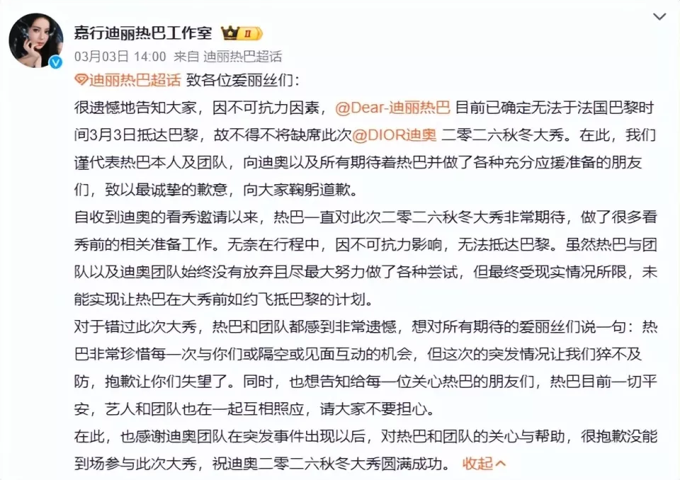 没想到工作室捅了大篓子,工作人员和造型团队直接飞巴黎,却让迪丽热巴在迪拜转机。