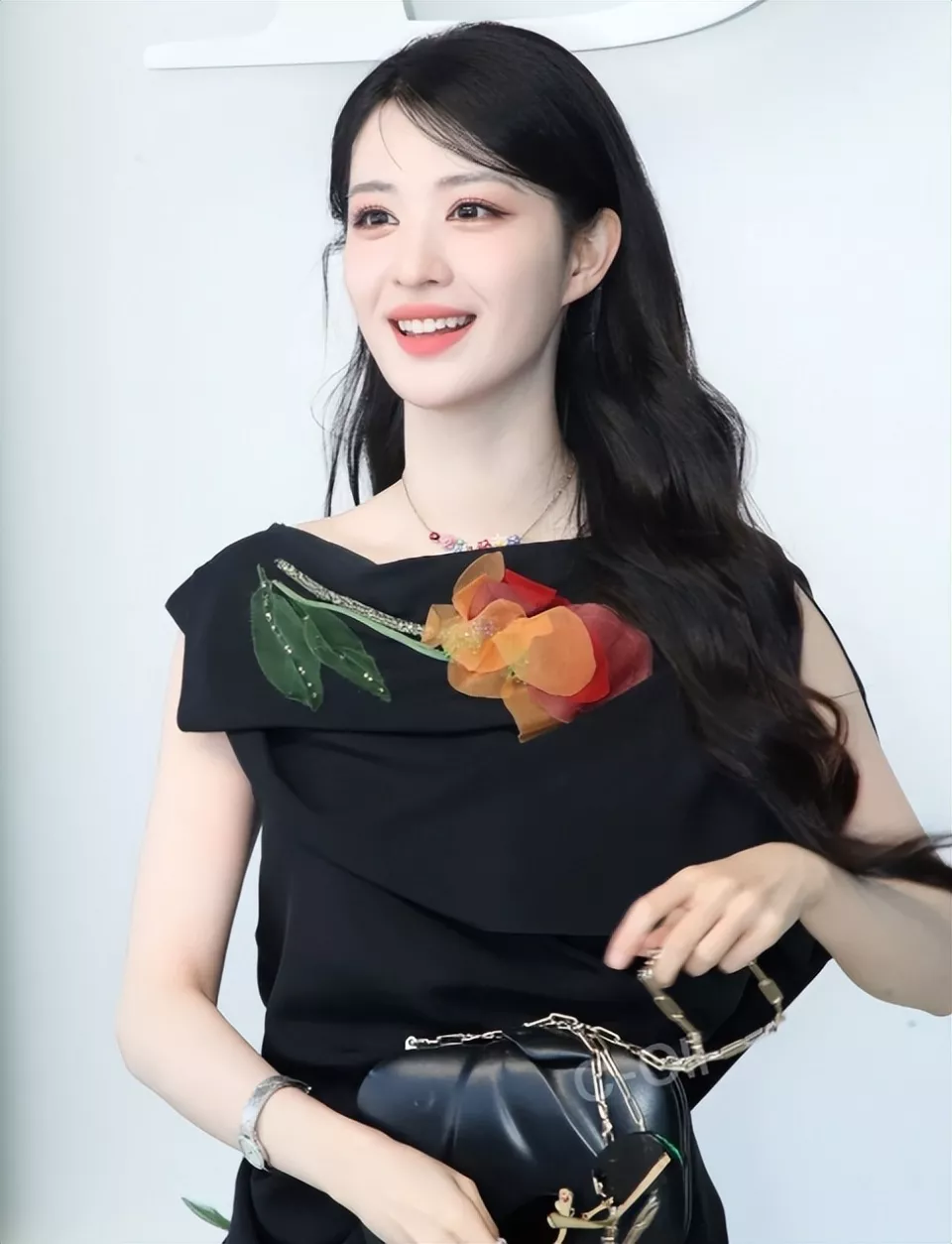 光是这件黑色连衣裙就土得掉渣了,尤其是胸前的花朵设计,总感觉像90年代的款式。