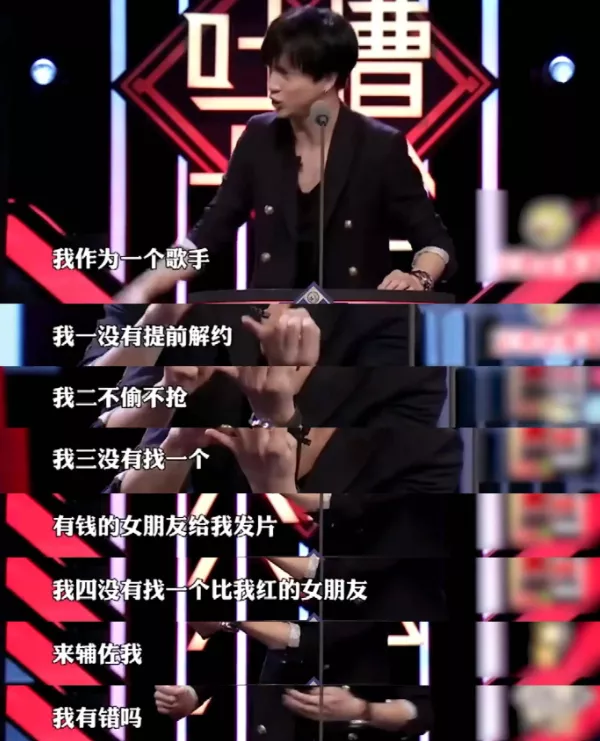 前者在《吐槽大会》上提到“我作为一个歌手啊,我一没有提前解约,我二不偷不抢,我三没有找一个有钱的女朋友给我发圈,我四没有找一个比我红的女朋友来辅佐我,我有错吗?”