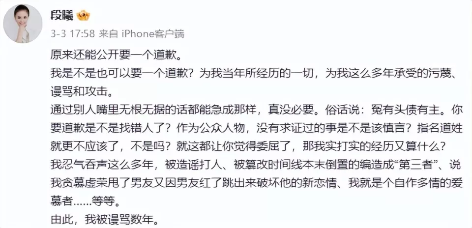更重要的是他们在未分手期间,张杰就跟谢娜在一起了,网友却将段曦当成是破坏两人感情的第三者,导致她多年承受网络暴力的痛苦,如今也要趁此机会讨个说法。