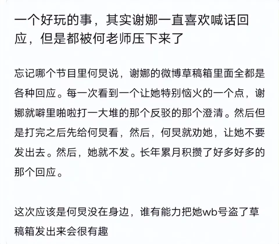 以前在节目中何炅就透露过谢娜很喜欢喊话回应,微博草稿箱里全是她未发出去的文章。