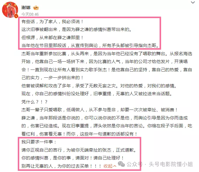 3月3日一早,谢娜发长文公开喊话薛之谦,要求他道歉——