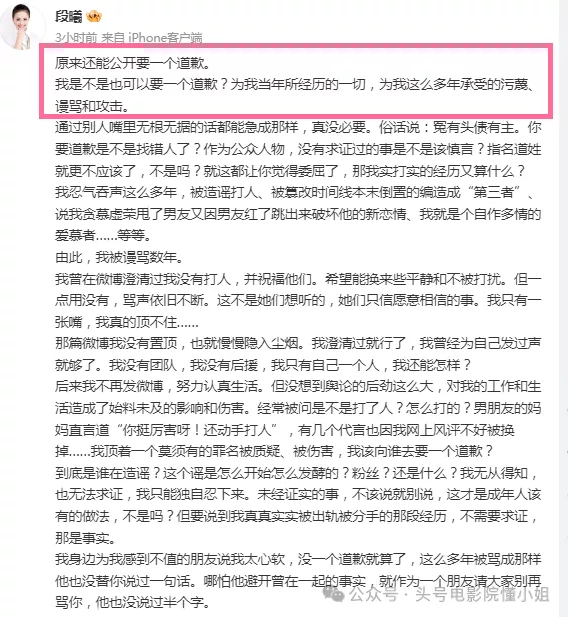 开头就很扎心:“原来还能公开要一个道歉。我是不是也可以要一个道歉?”