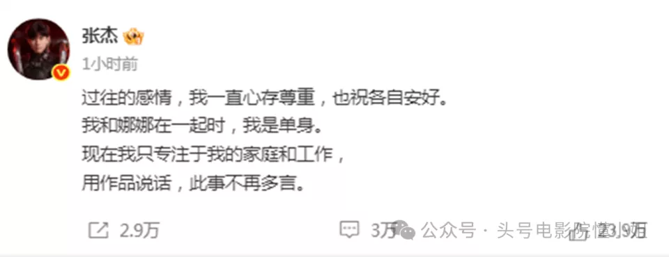 张杰发文:“过往的感情,我一直心存尊重,也祝各自安好。我和娜娜在一起时,我是单身。现在我只专注于我的家庭和工作,用作品说话,此事不再多言。”