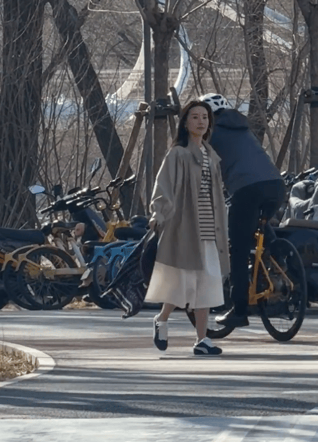 行走在户外小路上的董洁,姿态优雅,步伐轻盈,展现出良好的体态与气质,而背景中的树木与停放的电动车为画面增添了生活气息,阳光洒在她身上,更显温婉动人。