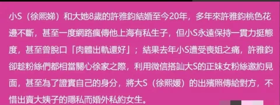 许雅钧丑闻越扒越多,难怪小S一直静悄悄,汪小菲母子太善良了