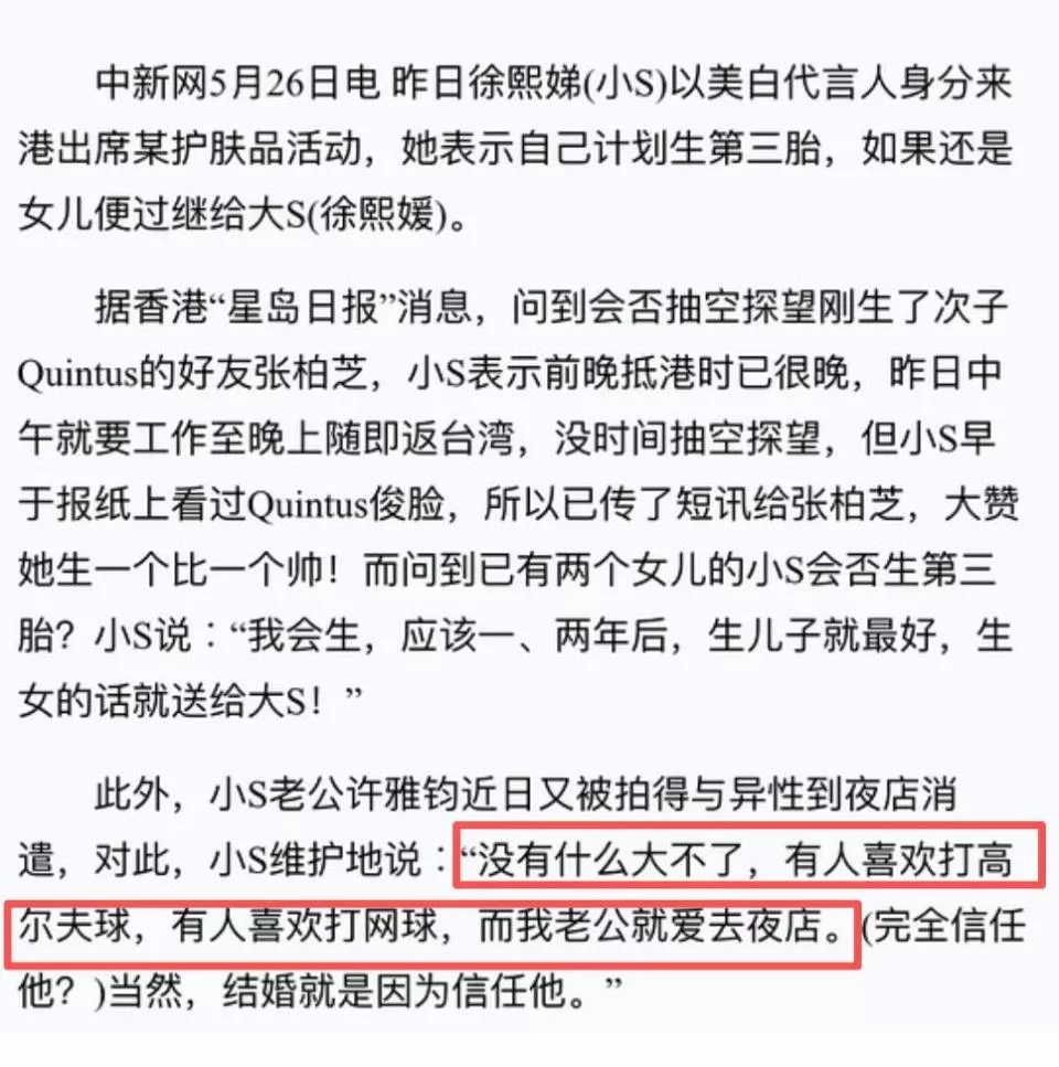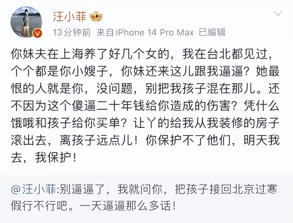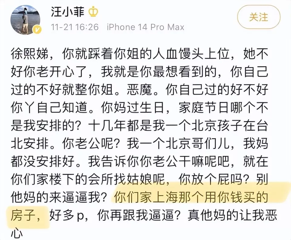 本来只是网络传闻,大家也就当个乐子看,但汪小菲跟大S开战时,突然把矛头转向了小S,并连发几条数落小S的微博,多次提到小S老公在上海包养其他女生。