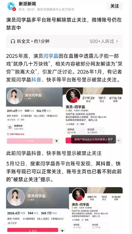 时隔两个月,2026年3月12日,同样是多家媒体报道,闫学晶多个平台账号悄然解除了“禁止关注”的处罚,只剩下微博平台。