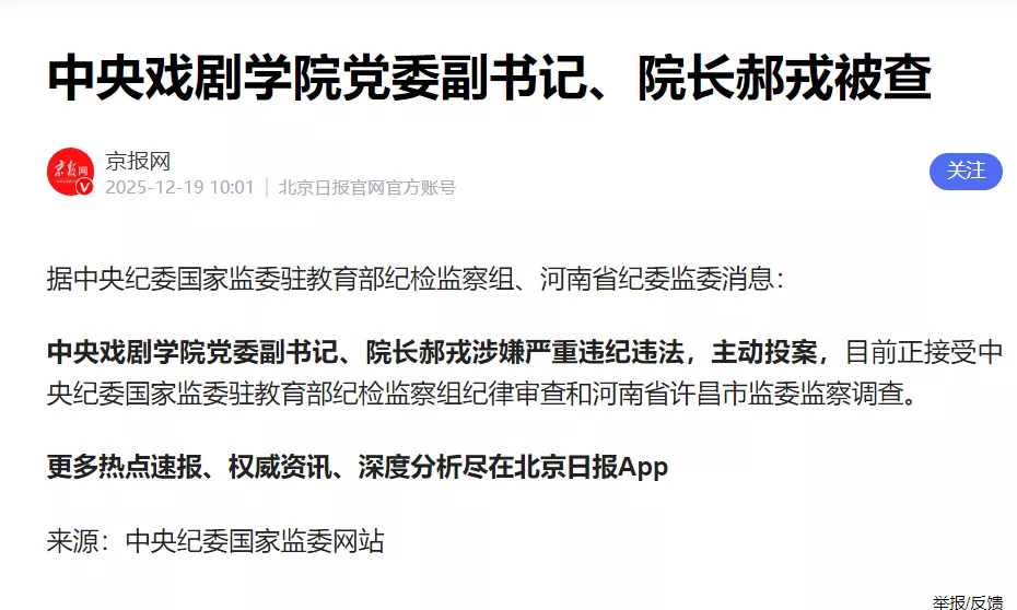 2025年12月,中央戏剧戏院原院长郝戎被查,有一部分自媒体将此事和闫学晶事件联系在了一起,认为这是闫学晶导致中戏院长被查。