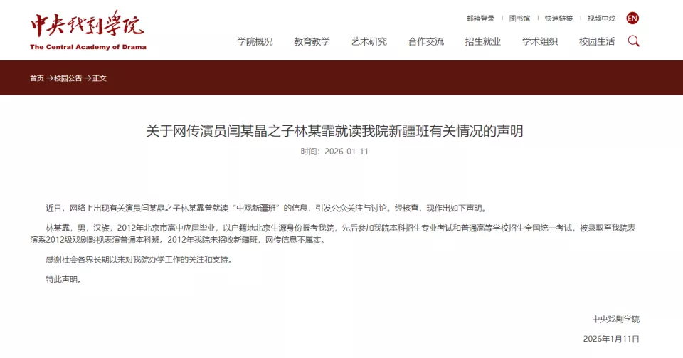 2026年1月11日,中央戏剧学院发布官方声明,证实林傲霏是中央戏剧学院表演系2012级本科班学生,2012年中戏没有招收新疆班。