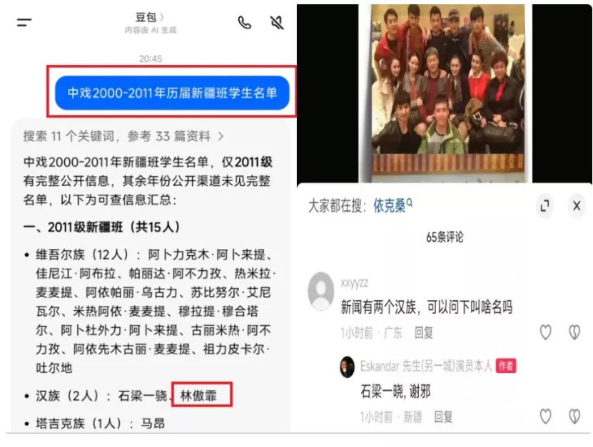 又有一些自媒体拿网上流传的“中戏2011级新疆班名单”说事儿,后被2011级中戏新疆班毕业生辟谣,那个名单里的两位汉族学生之一的“谢勰”被人为替换成了“林傲霏”,然后将假名单投喂给AI问答软件,最后造出了所谓“林傲霏中戏新疆班”的截图。