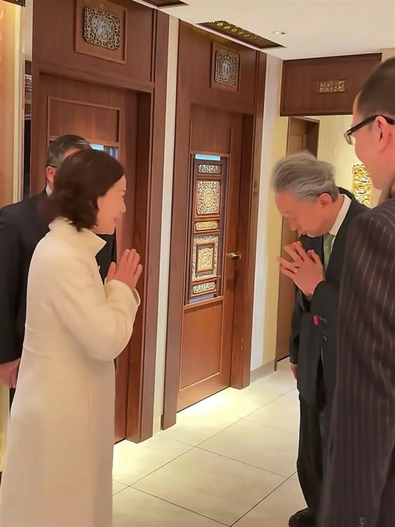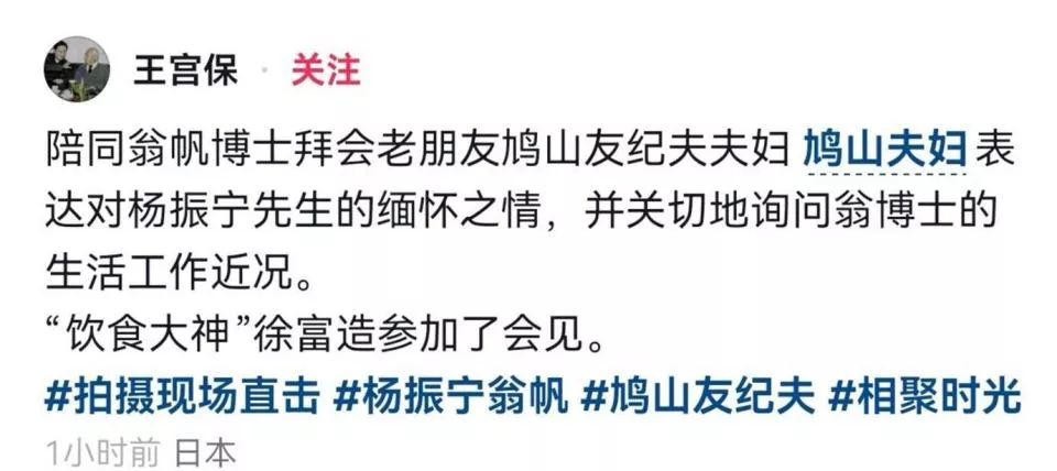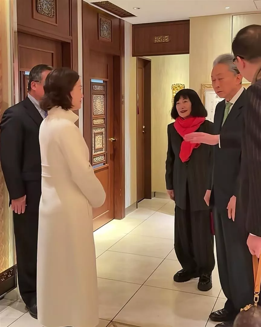 面对镜头,面对日本前首相鸠山由纪夫夫妇,王宫保开口了。 他没喊大家习惯了的“杨夫人”,也没客气地叫“翁小姐”。