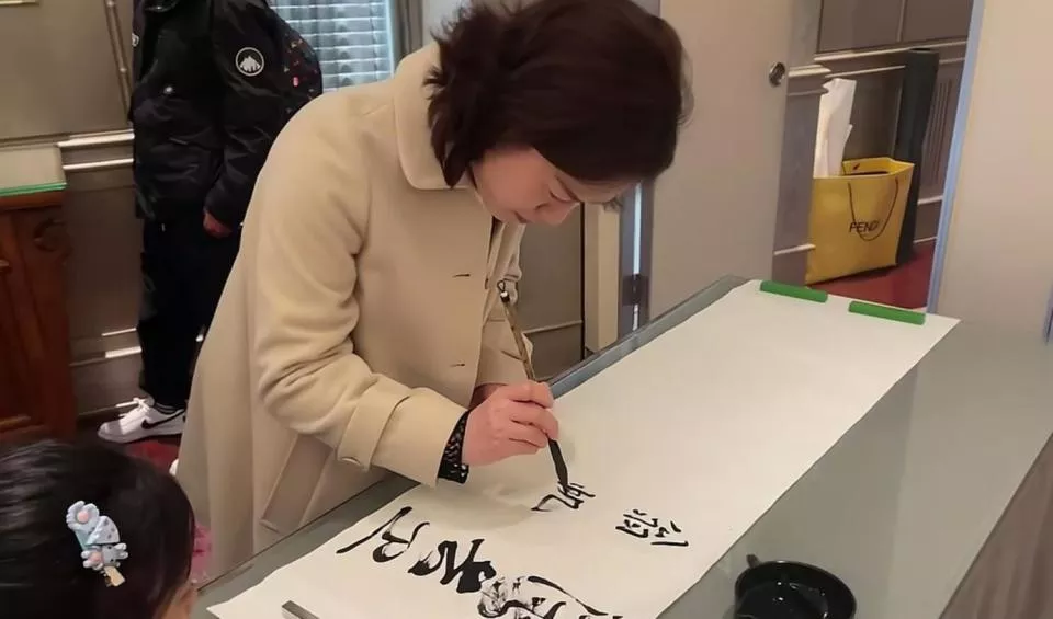 镜头里,49岁的翁帆穿着一件素色风衣,头发烫了微微的卷,正握着毛笔在签到。她写字的模样气定神闲,写完抬头那一瞬间,甚至还带着点害羞的笑