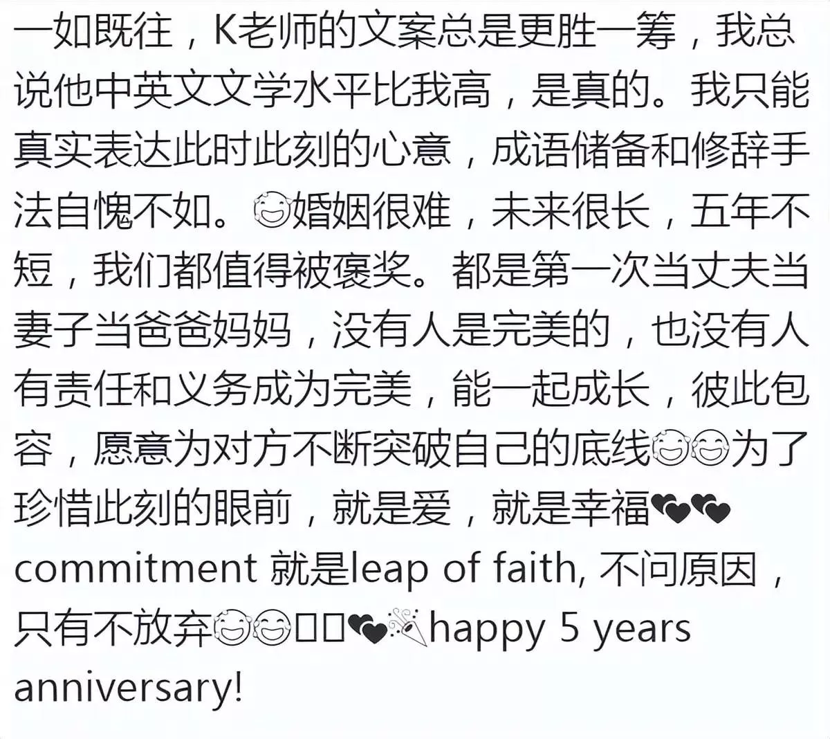 不知不觉,到了他们结婚5周年纪念日。朱珠说自己的文学水平比不上老公,但此刻是很幸福的。